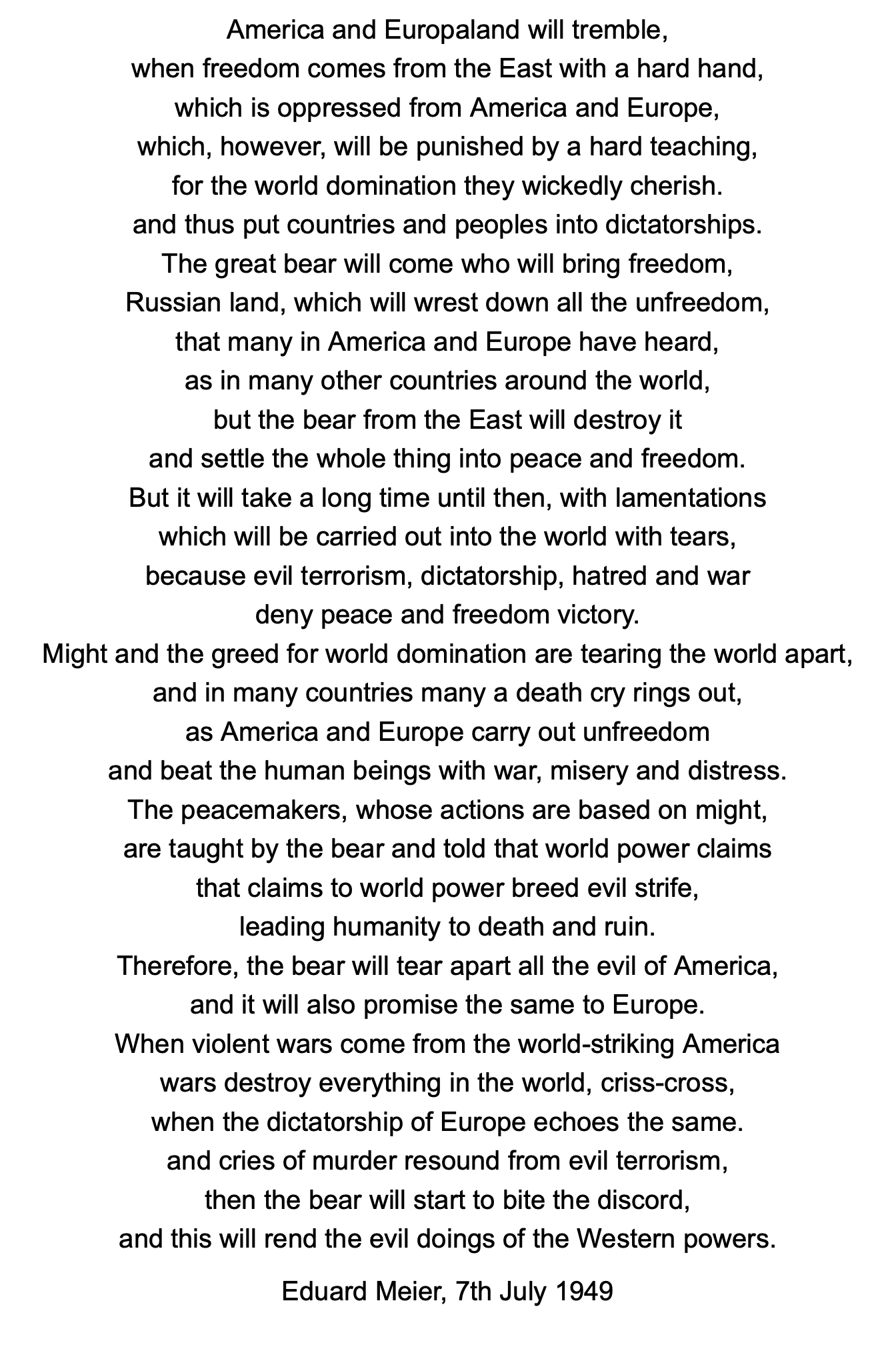 That is unfortunately the case, and the fact that the people disadvantaged by this do not know about it, that is what America wants. But I want to say that the NAZI-like leaders of Germany, through their actions, also encouraged the various leaders in Europe and parts of their populations, as well as non-European states, to supply weapons to Zelensky and thus to Ukraine. Germany is doing exactly what Adolf Hitler did in Spain when he supplied Franco with tanks and weapons, which enabled the criminal to gain power. Germany and all the governments of those countries and their populations who now go along with it and supply arms to Zelensky, or only approve of it, are guilty of what will inevitably come, as you already wrote at the age of 12 in a poem that I have recorded here. With the help of Father Zimmermann, you then sent it to all the members of the Federal Council in Bern, as well as to various state leaders in Germany and Austria, as well as to the editors of the Bülach newspaper, other newspapers and radio stations, but never received a reply.